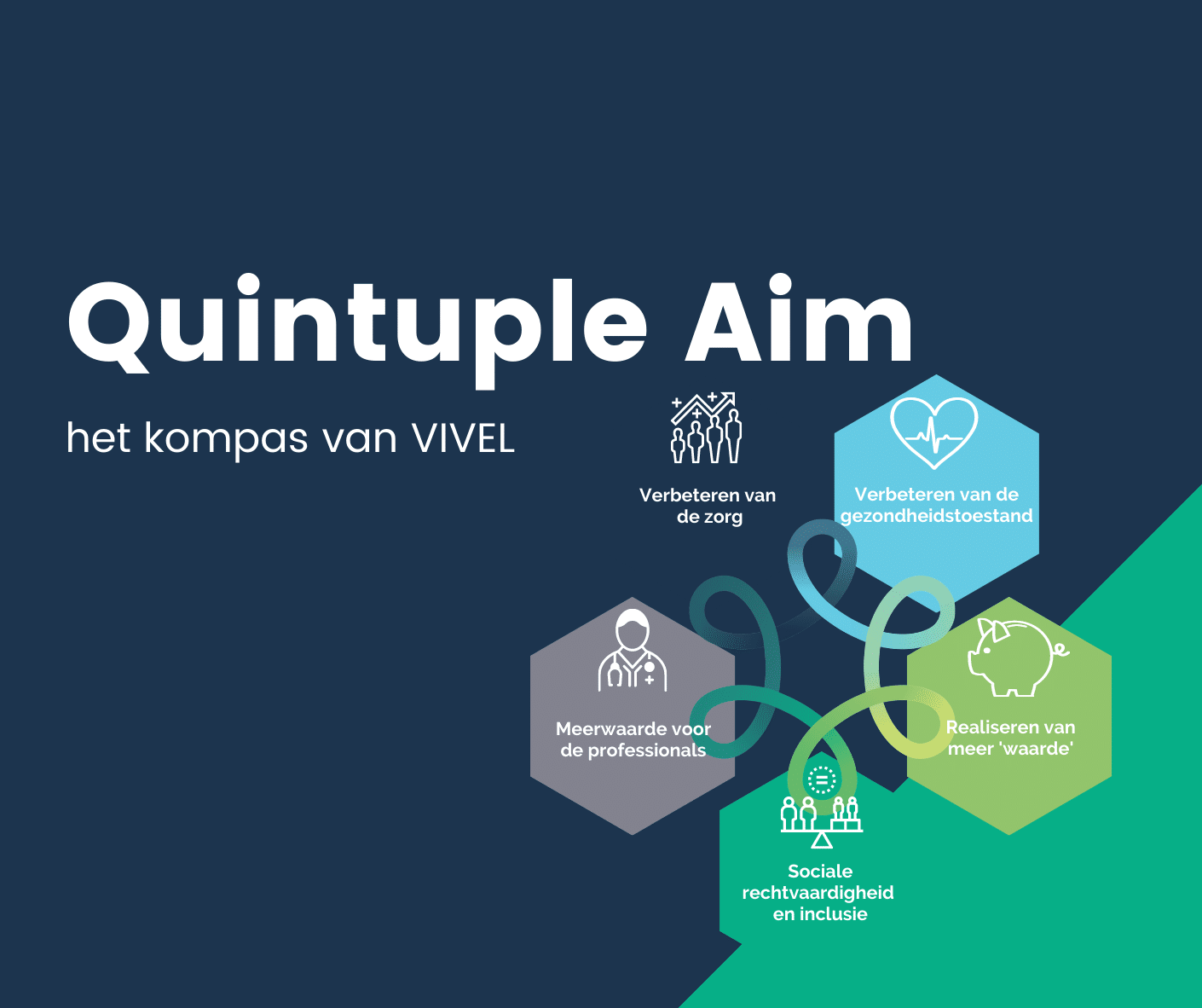 Bij VIVEL hanteren we deze Quintuple Aim als toetssteen voor al onze strategieën en beslissingen. Deze vijf pijlers vormen ons kompas. De bedoeling? Met de ingezette middelen een effectievere en efficiëntere zorg organiseren, problematieken op bevolkingsniveau aanpakken, bijdragen tot sociale cohesie, een tevredener persoon en mantelzorger en zorgaanbieders die hun job met voldoening uitvoeren. Vijf doelstellingen waar tegelijkertijd op dient te worden ingezet. En dat VIVEL dit doet is niet zonder reden. VIVEL heeft ook een strategische en innovatieve opdracht en volgt de internationale ontwikkelingen. Bovendien staan de achterliggende keuzen en waarden van de Quintuple Aim in onze missie.